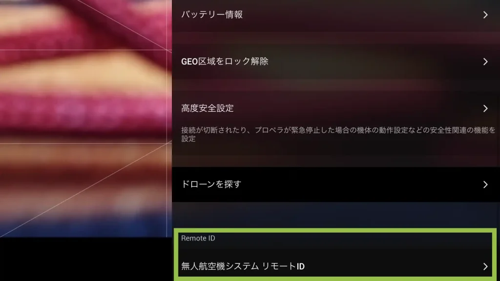 ファームウェアが問題なく更新されていれば、操作画面で表示されるメニューの一番下に「Remote ID」という欄で無人航空機システム リモートIDという項目が追加されているはずです。