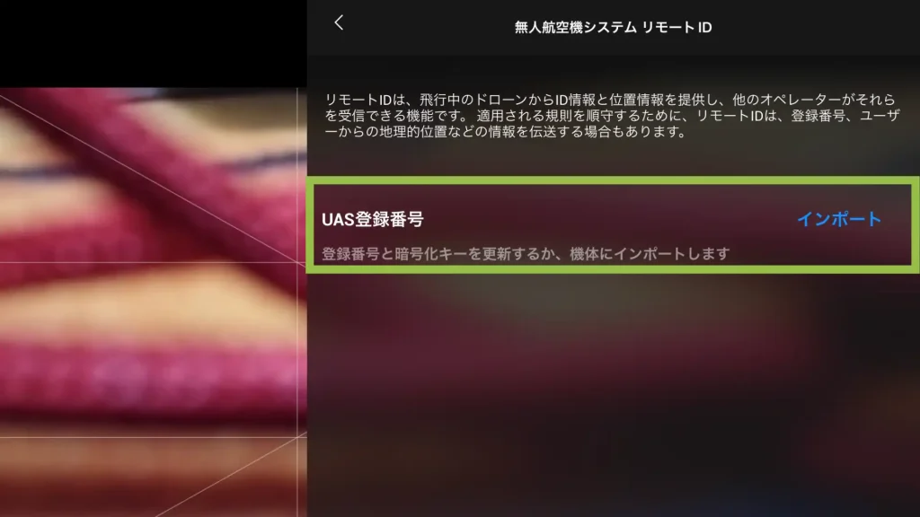 無人航空機システム リモートIDを選択すると「UAS登録番号」という項目が表示されます。右側に表示されるインポートをタップすることで、機体登録システムのログイン画面に移動します。