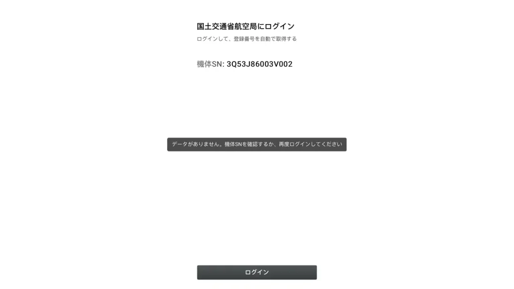 手数料も支払って登録記号が発行されているにもかかわらず「データがありません。機体SNを確認するか、再度ログインしてください」と言われるの、何かすごくモヤっとしますよね。データあるわって思ってしまいます。