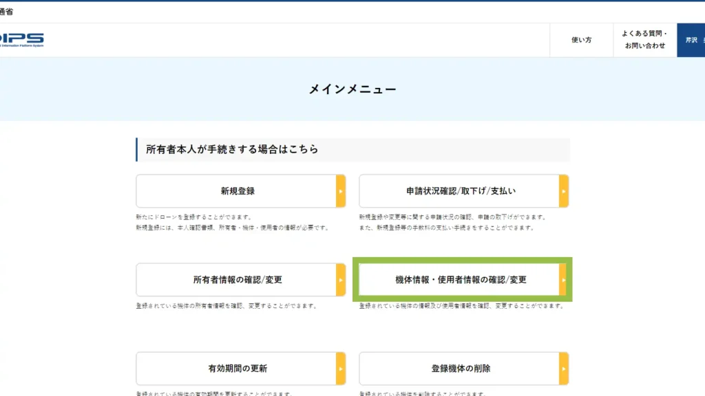 機体登録システムのDIPSにログインしたら、メニューから「機体情報・使用者情報の確認/変更」を選択してください。