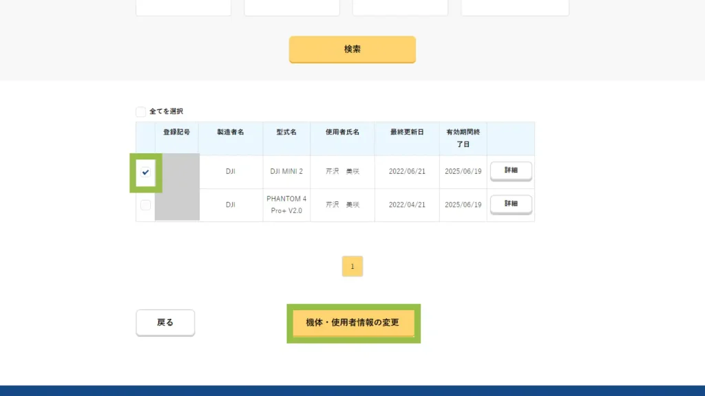 必ず対象の機体欄の一番左にある四角にチェックを入れて「機体・使用者情報の変更」を選択します。