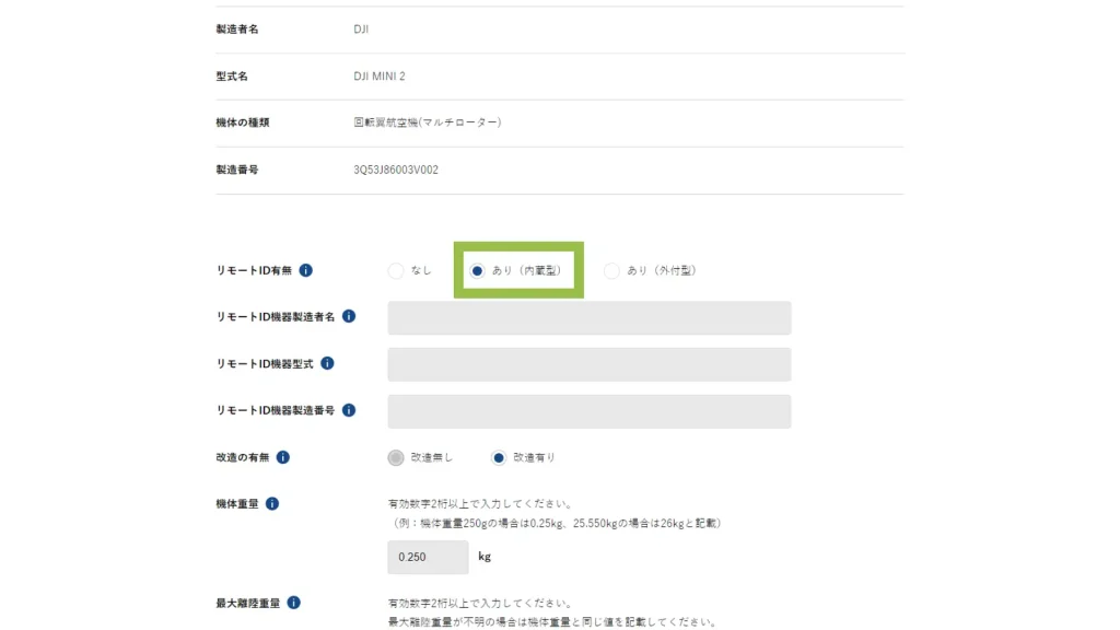 Mini2/Air/Air2SはMini3 Proと同様にリモートID機能を内蔵するドローンとなるため、リモートID有無の欄で「あり(内蔵型)」を選択しなければいけません。