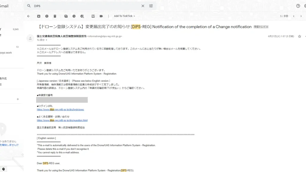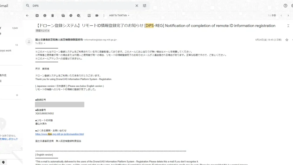 ちなみにリモートID機能と登録記号が紐付けされるとDIPSから「【ドローン登録システム】リモートID情報登録完了のお知らせ」というメールがやってきますが、特に何もすることはありません。
