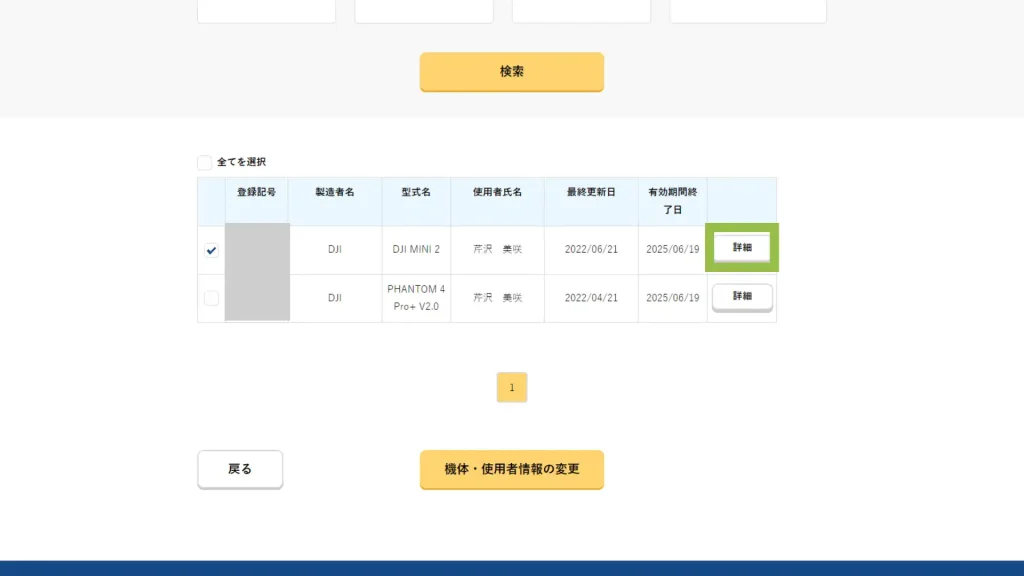 自分の所有するドローンがどういう申請内容で機体登録が行われているかを、詳細ボタンを選択して確認します。